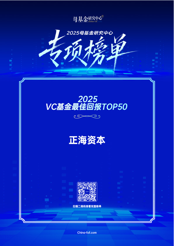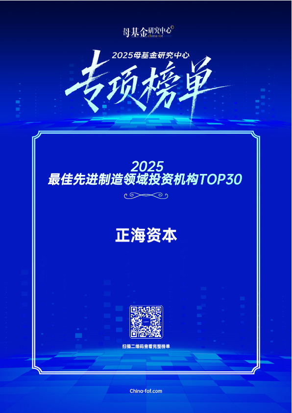 在此背景之下,母基金研究中心(www.china-fof.com,下同)根据已有的数据支撑与研究分析,正式发布2025年度专项榜单,以此鼓励私募股权母基金与基金行业的优秀机构与人才,促进股权投资行业的健康发展。正海资本荣登2025最佳先进制造领域投资机构TOP30、2025VC基金最佳回报TOP50。