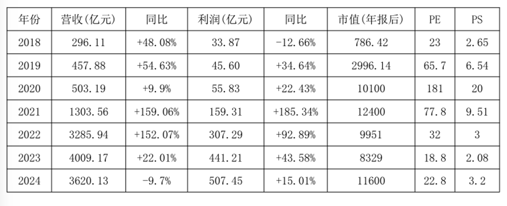 为此我整理了动力电池龙头企业自上市以来的营收、利润、市值等数据,发现其高估值集中在2019、2020、2021三年,分别为市盈率(以下简称PE)65.7倍、PE:181倍、PE:77.8倍。